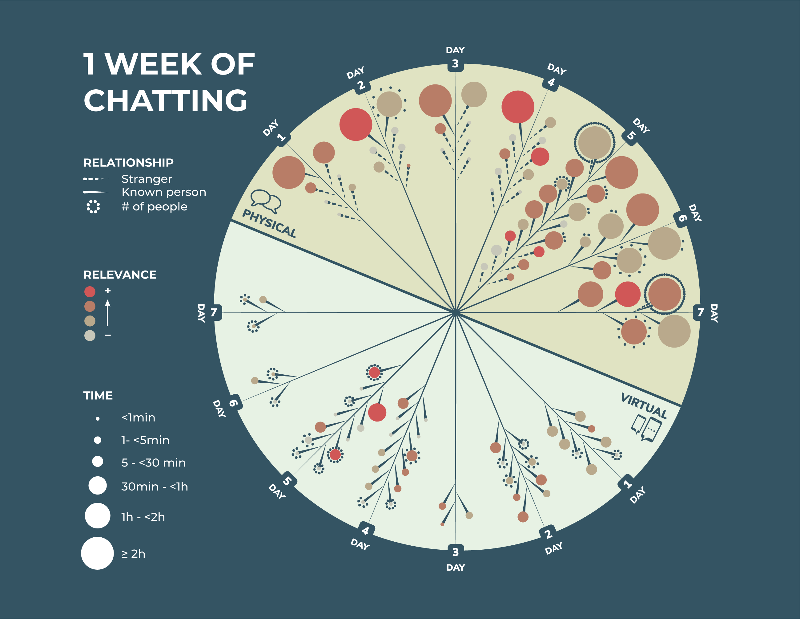 I classified my talks by physical (face to face) and virtual (chat, audiochat, or call) and made the categories based on the relevance of the topic, duration, and my relationship with the person or persons. "Dots" show a conversation with multiple people.