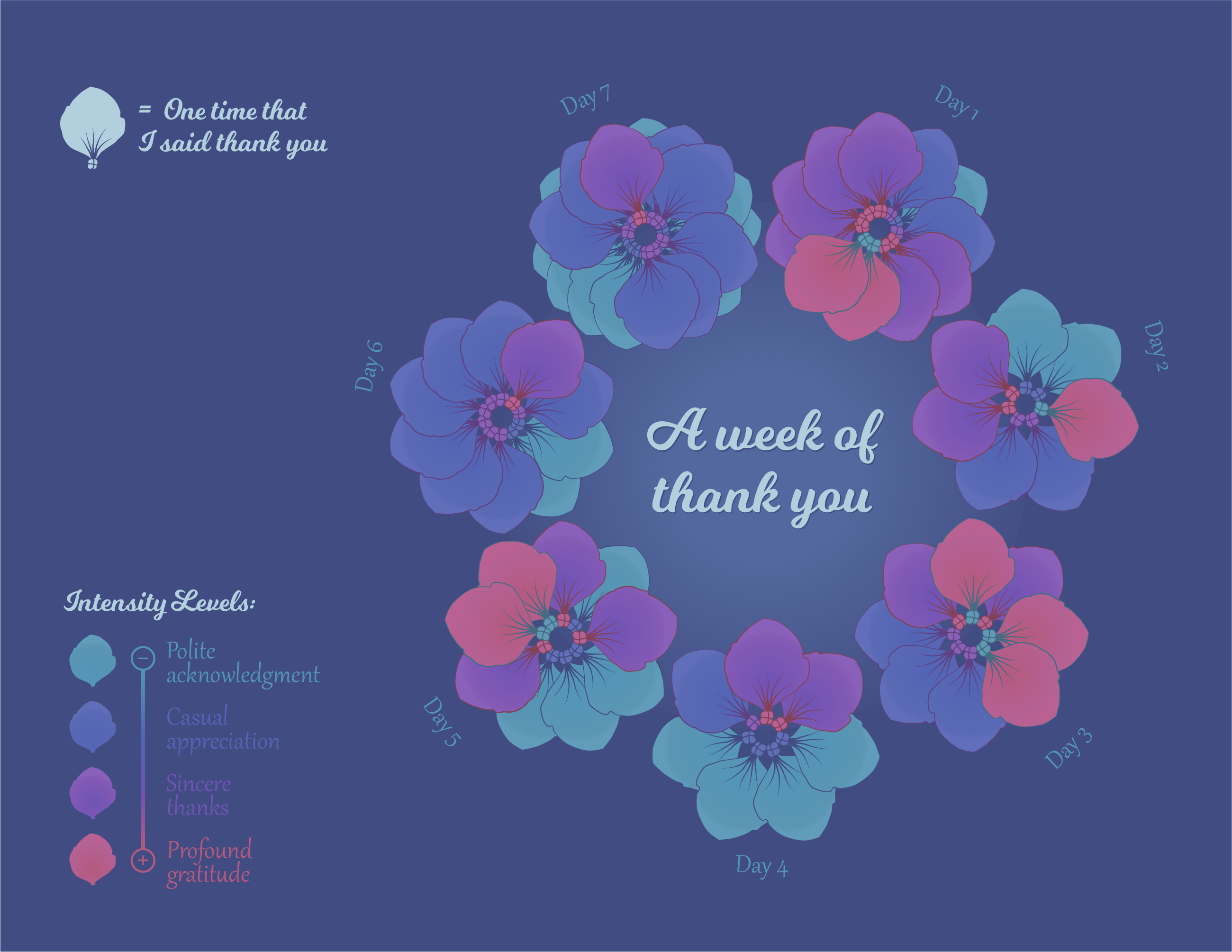 I tracked the number of times I say “thank you.” Surprisingly, many times I was saying it automatically, without even thinking. So, I decided to visualize the intensity level, ranging from polite acknowledgment to profound gratitude. I represented these levels as petals that come together to form beautiful flowers, reminiscent of how we use flowers as a way to express gratitude.